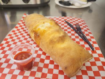 Filled with a mixture of ricotta & mozzarella cheese. Add some toppings as well. Comes with a side of marinara sauce. Ask for sauce inside or just outside. Depending on how hungry you are, good for two to share!