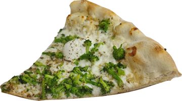 White Sauce made with olive oil and fresh garlic. Topped with mozzarella and splats of ricotta cheese. Choose any topping. Shown with broccoli.